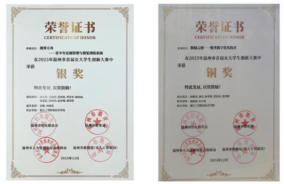 12月2日,“建行杯”2025年温州市首届女大学生创新大赛总决赛在温州大学圆满落幕。浙江工贸职业技术学院选送项目表现优异,其中《视界方舟——青少年近视管理与视觉训练系统》荣获银奖,《数履云创——鞋类数字化实践者》荣获铜奖,展现了我校学子在人工智能与大健康、数字经济交叉领域的创新实力与实践风采。